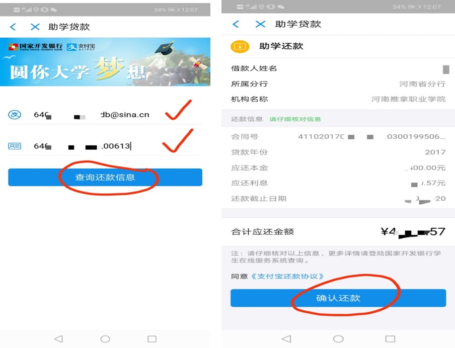 3.再次输入“贷款支付宝账号和密码”→点击“查询还款信息”(认真核对自己的信息)→“确认还款”