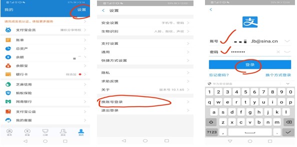 1.打开手机支付宝APP →设置→换账号登录→输入“贷款支付宝账号和密码” ,点击“登录”。 (学生可以登录国家开发银行学生在线服务系统(https://www.csls.cdb.com.cn)在“我的首页”查询个人支付宝还款账号、支付宝初始登录密码和支付宝初始支付密码。)