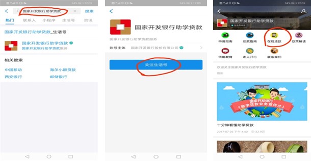2.打开支付宝,在首页搜索“国家开发银行助学贷款” →点击“关注生活号”→“在线还款”。