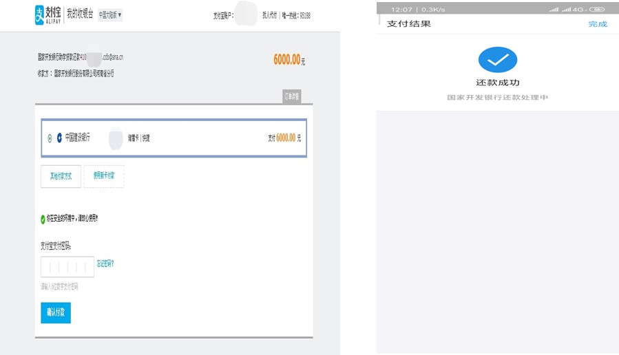 4.选择合适的付款方式,输入学生在线服务系统中显示的支付宝初始支付密码后,点击“确认付款” →“还款成功”