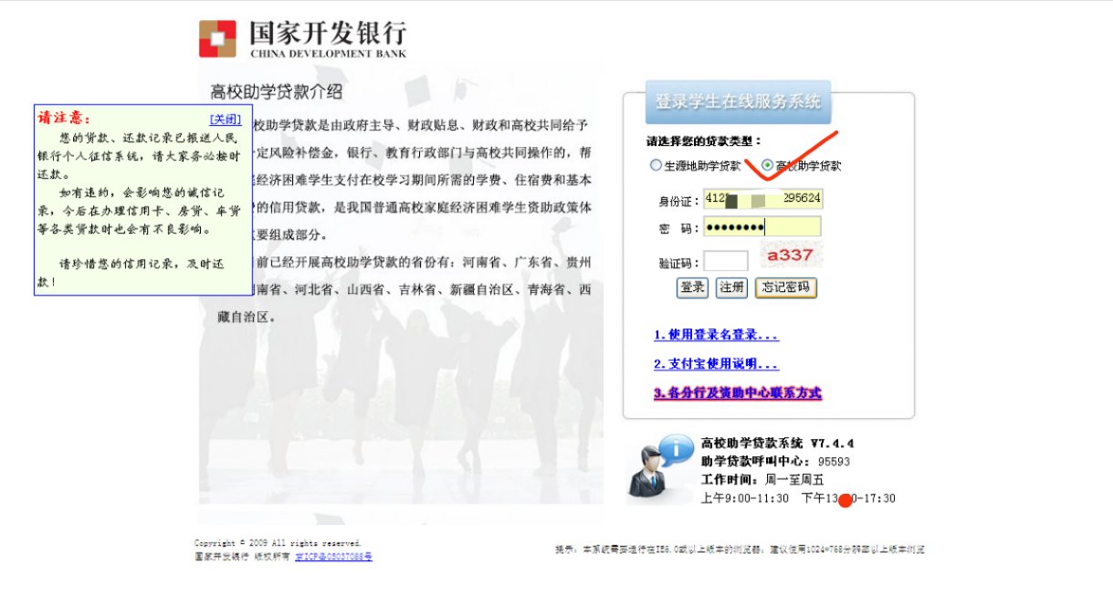 温馨提醒:学生在校期间的利息由政府贴息,从毕业之日(6月30日)利息自付,建议毕业前还清贷款。如因家庭经济困难,毕业时无法偿还的,每年的12月20日之前一定要把当年的利息足额存到贷款支付宝账号里,否则会造成利息逾期。合同到期前半年务必将贷款全部结清,否则可能造成逾期或违约。所有的逾期将计入国家征信系统,对个人将来的学习、生活和工作造成不利影响,请同学们珍爱信用,按时还贷!!!